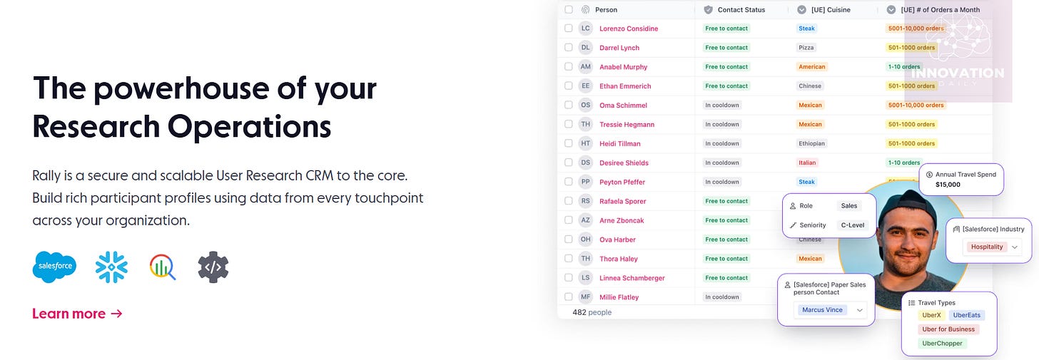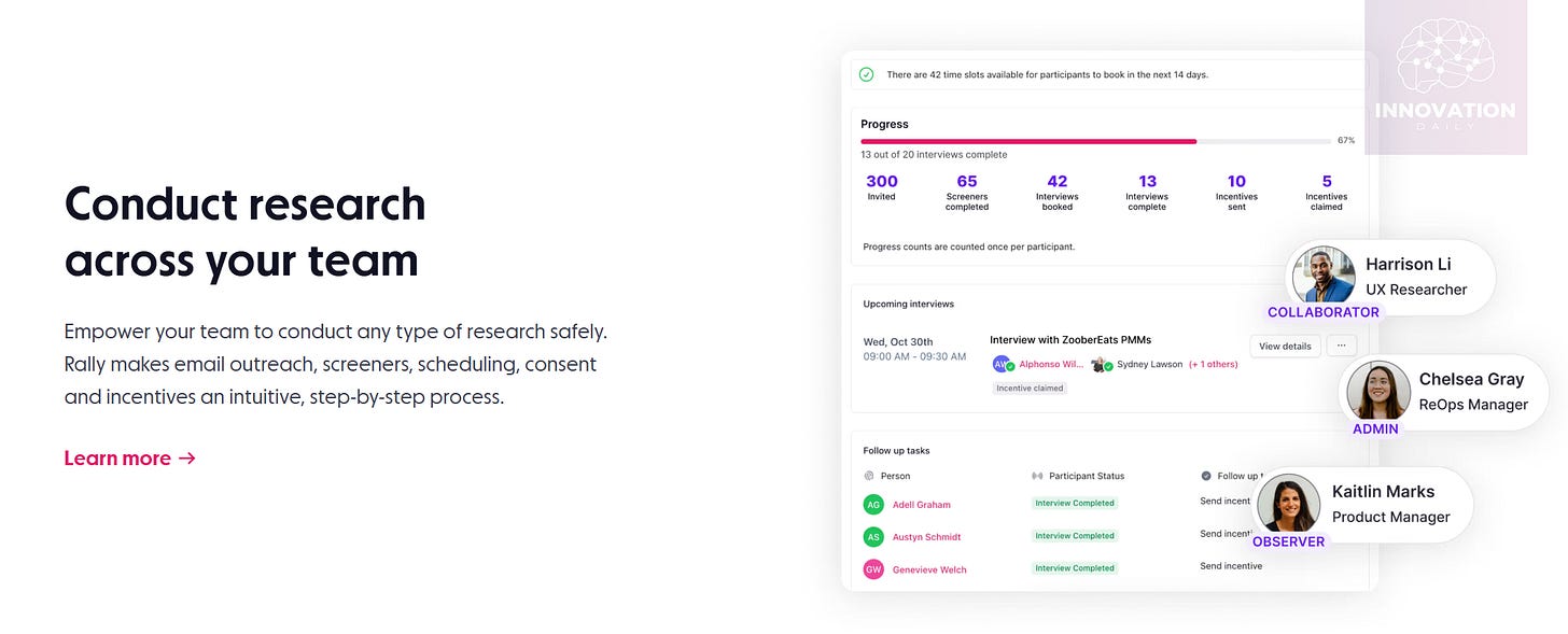 Rally presents itself as a “modern CRM” designed specifically for user research. It helps product teams streamline and scale the way they collect feedback from real users through interviews, surveys, and other methods.