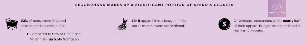 According to ThredUp, 52% of buyers purchased secondhand clothing in 2023. Among Gen Z, that number jumps to 65%. Two in five items sold in the past year were secondhand — accounting for nearly half of all clothing spend.