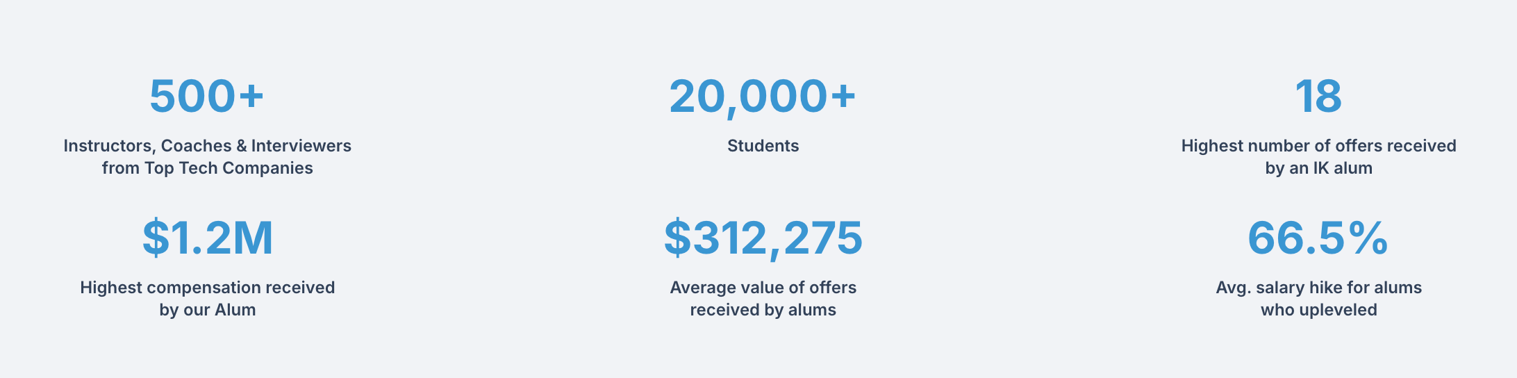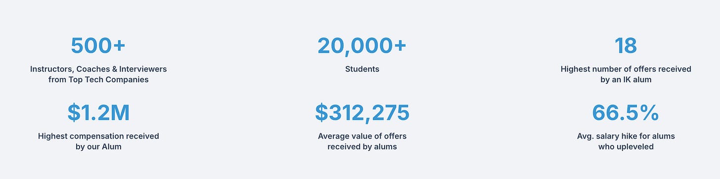 Founded in 2014, Interview Kickstart grew profitably without outside funding. Over 17,000 students have gone through the programs, with average post-course salary bumps of 66.5%. One graduate reportedly landed a $1.2 million/year job offer. On average, grads receive 18 job offers.