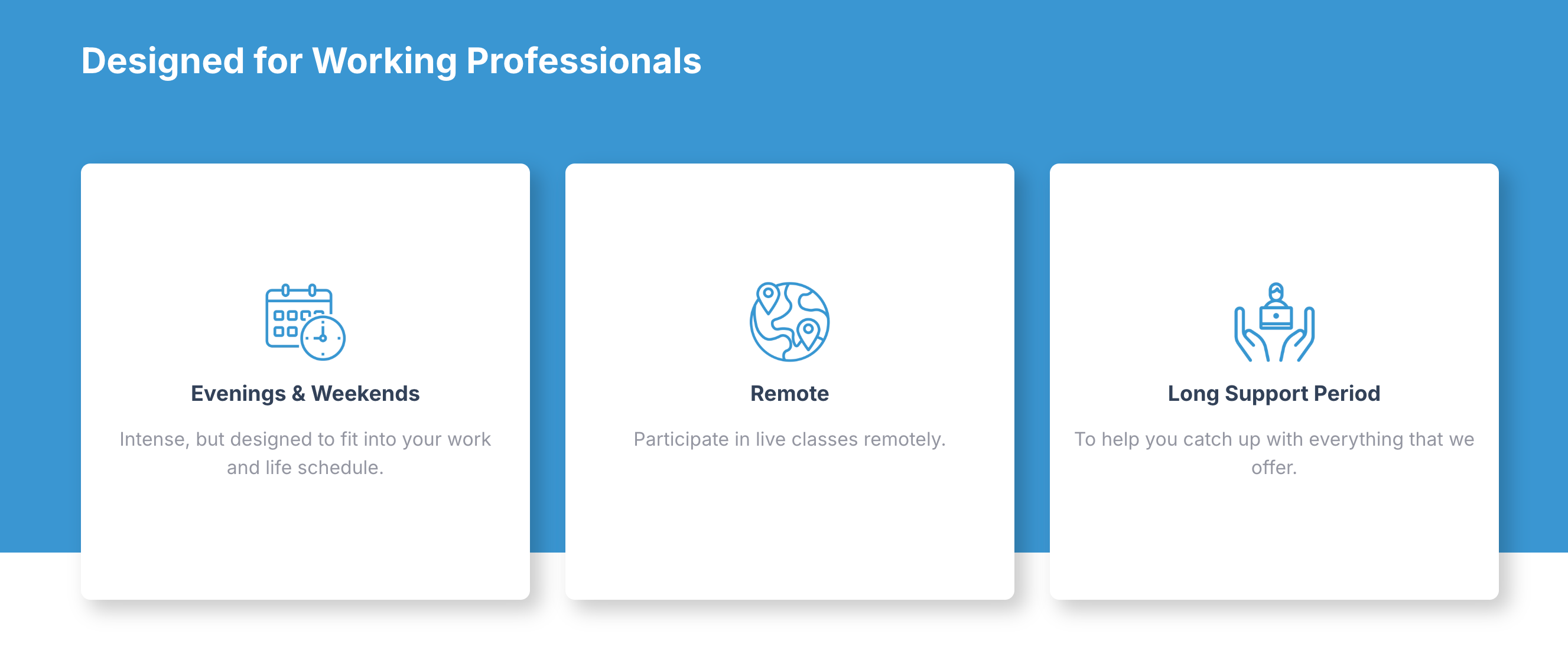 Pros already have income and are willing to invest in big salary bumps. High ticket prices allow you to offer more hands-on support and personalized guidance — without burning money on low-quality leads or predatory financing schemes.