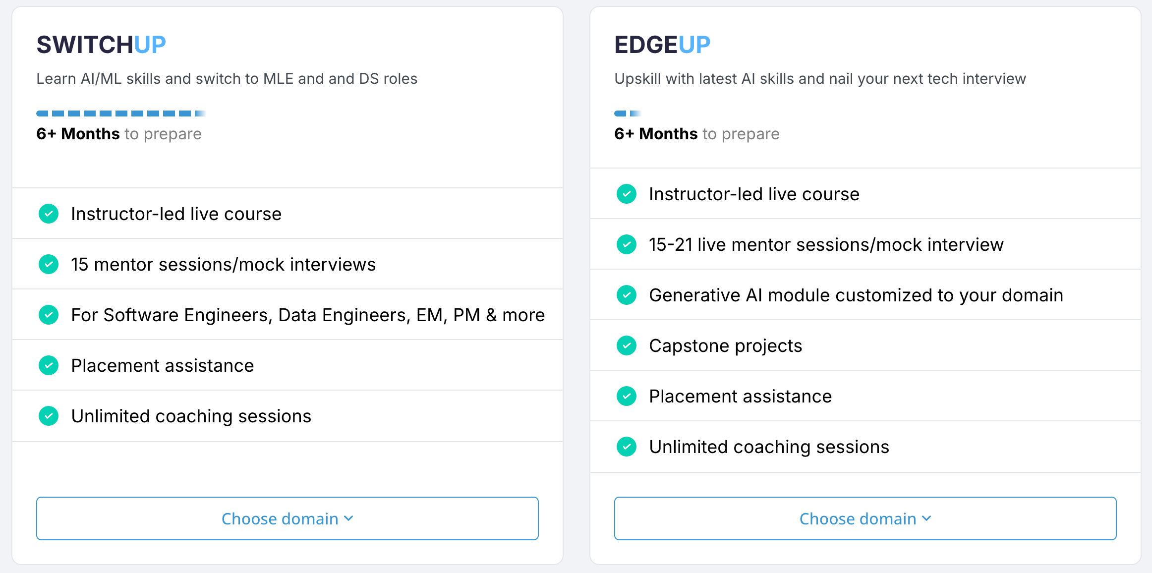 Skill upgrade (2+ months): Live classes but no mock interviews — aimed at improving current job performance.