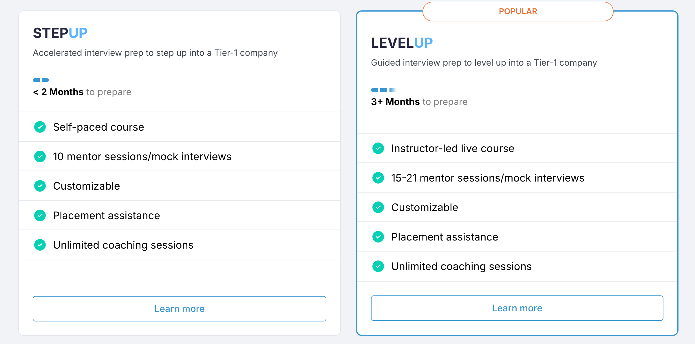 Big tech prep (3+ months): Includes mock interviews and even guidance on getting work visas.