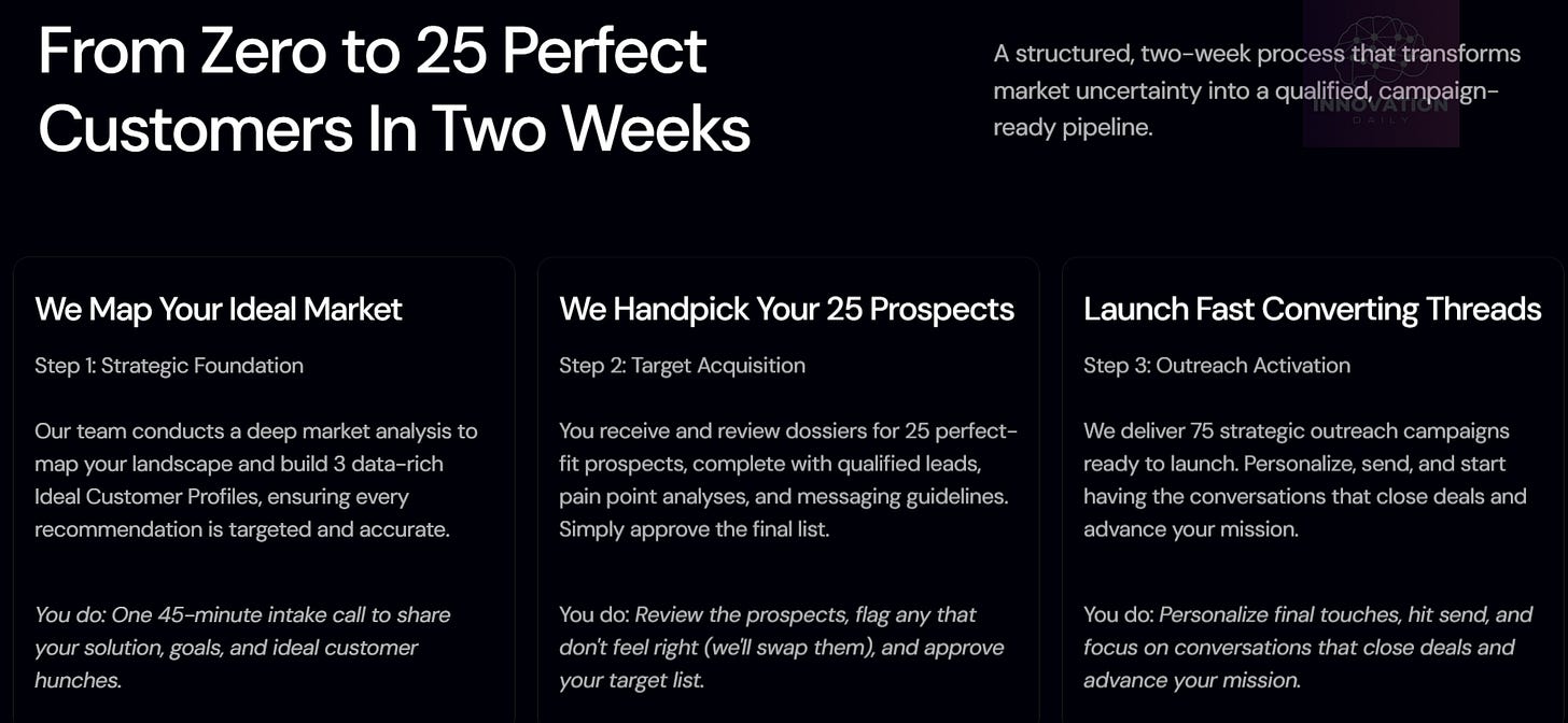 Instead, the company offers a very concrete promise: identify 25 ideal customers and launch 75 outbound campaigns designed to find more lookalike prospects — all in just 14 days.
