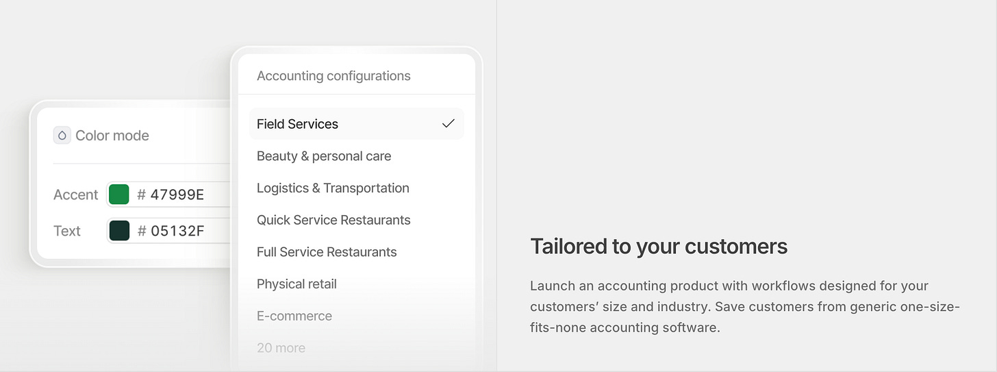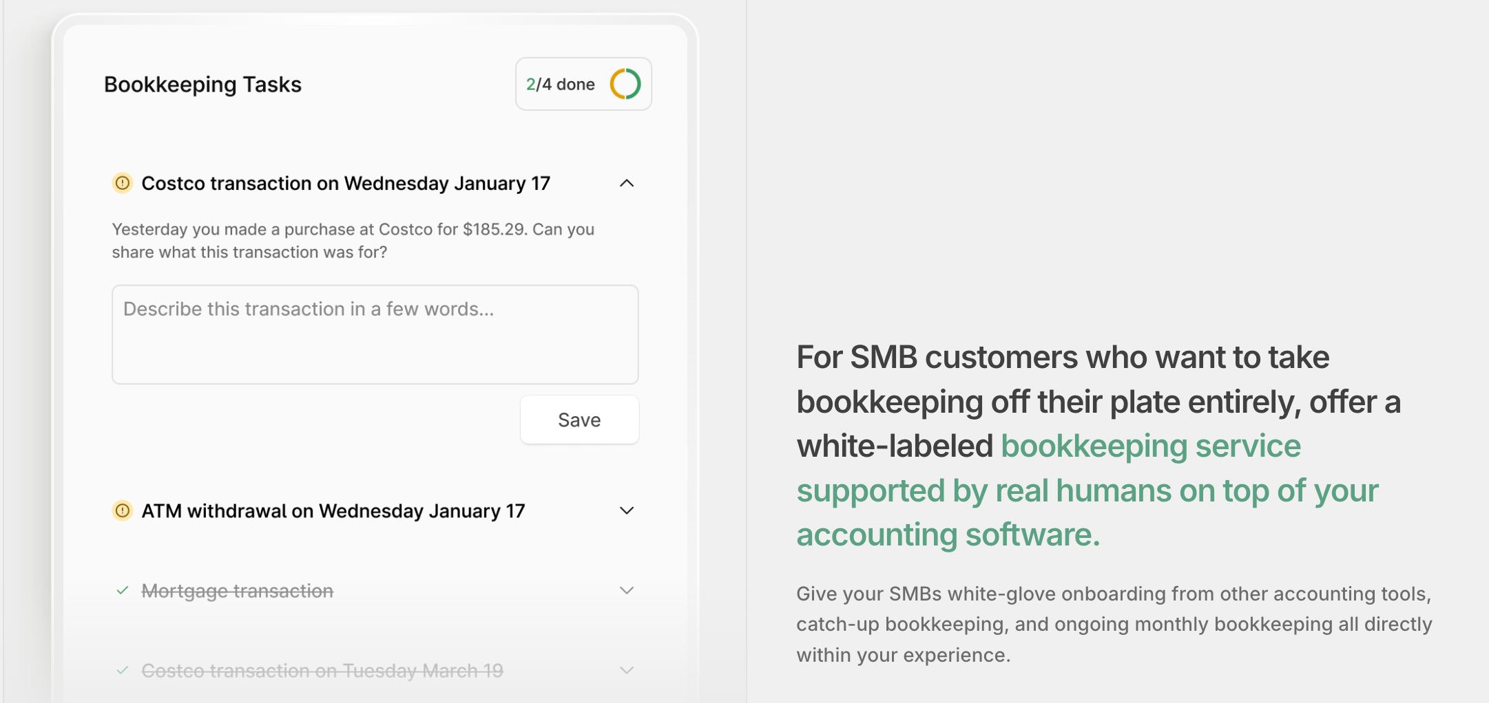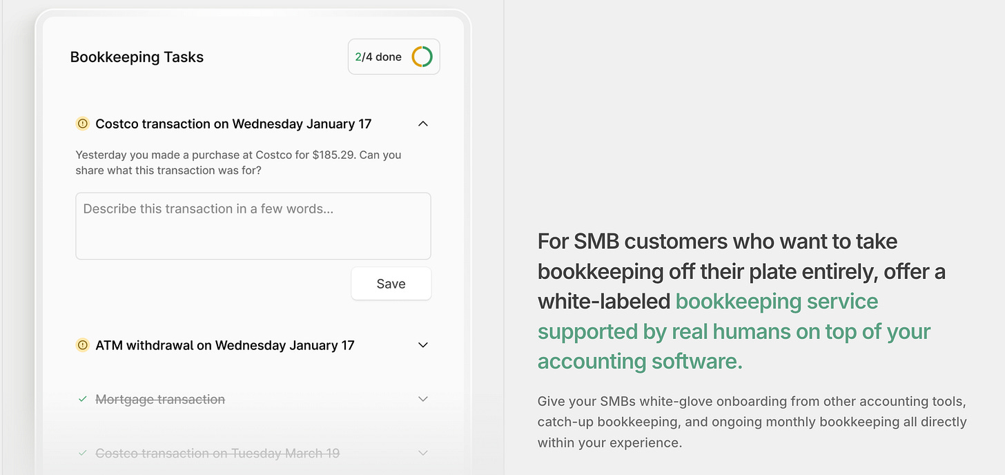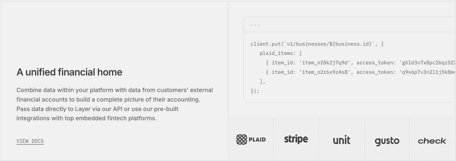 Layer can be described as “embedded” accounting. Developers of vertical (industry-specific) cloud services for small businesses can integrate Layer into their platforms. This allows their clients to manage their bookkeeping directly within the service’s dashboard.