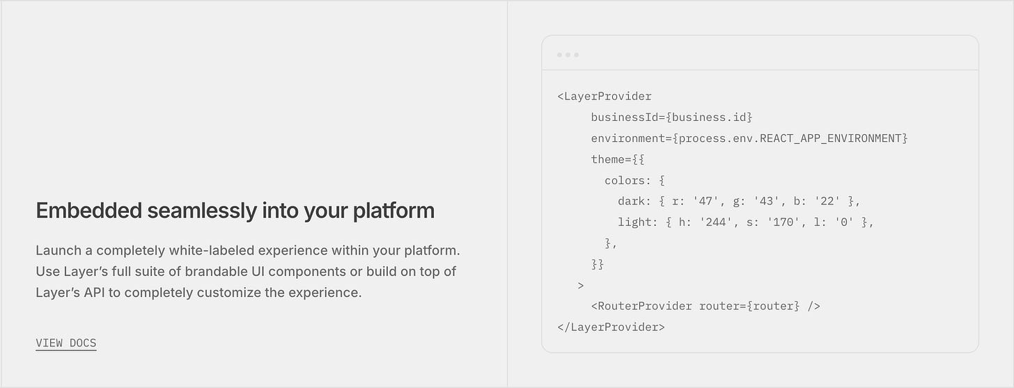 Integrating Layer is relatively straightforward. Developers simply add API calls to reflect operations and display Layer’s accounting interface within their service.