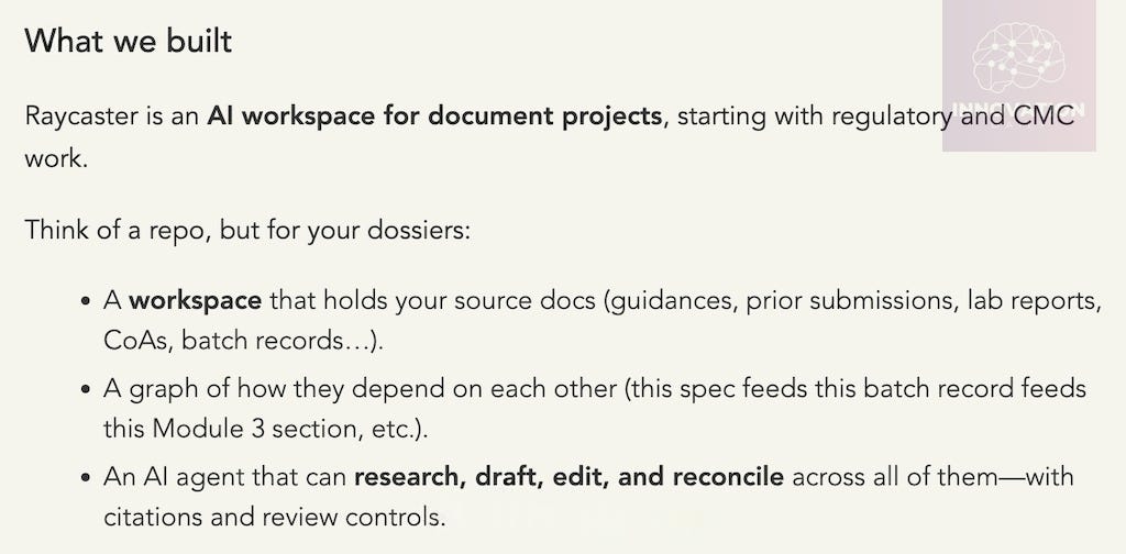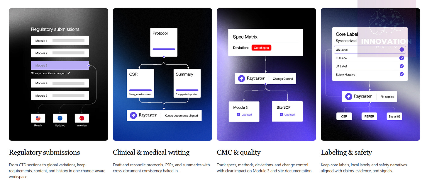 Raycaster’s platform enables teams to create those documents faster, earlier, and far more easily — covering everything from clinical trial preparation and reporting, to industrial and government certifications, to manufacturing protocols, quality control, and even multilingual labels and instructions that must comply with each country’s requirements.