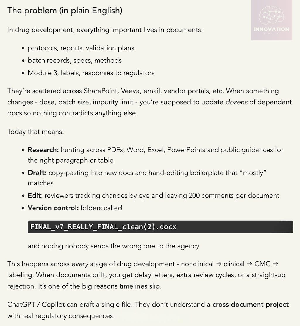 Building a documentation OS for biopharma might seem like a narrow niche, but there are many other fields where complex, interdependent documents are core to the workflow — and where errors or inconsistencies create real risks.