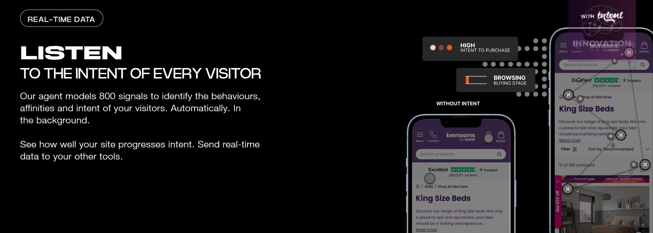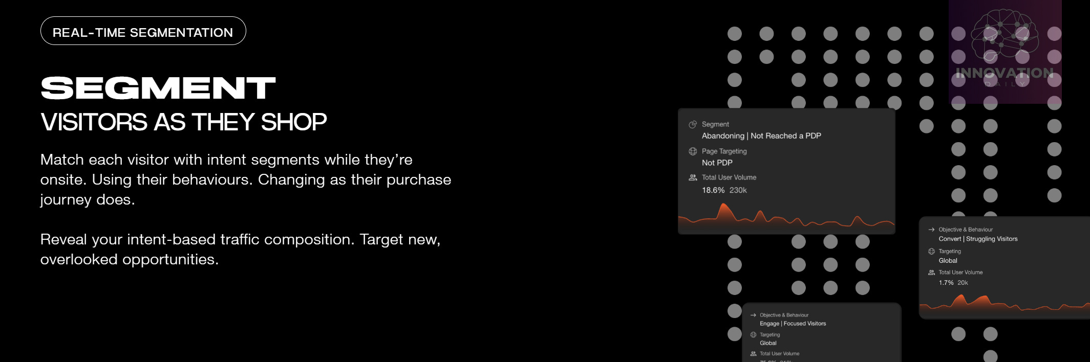 Made With Intent uses AI to analyze over 200 behavioral signals — from clicks to scrolling patterns — both in the current session and past visits. Based on this, it determines where a visitor is in the purchase funnel and assigns them to a dynamic segment. These segments are updated in real time as behavior shifts.
