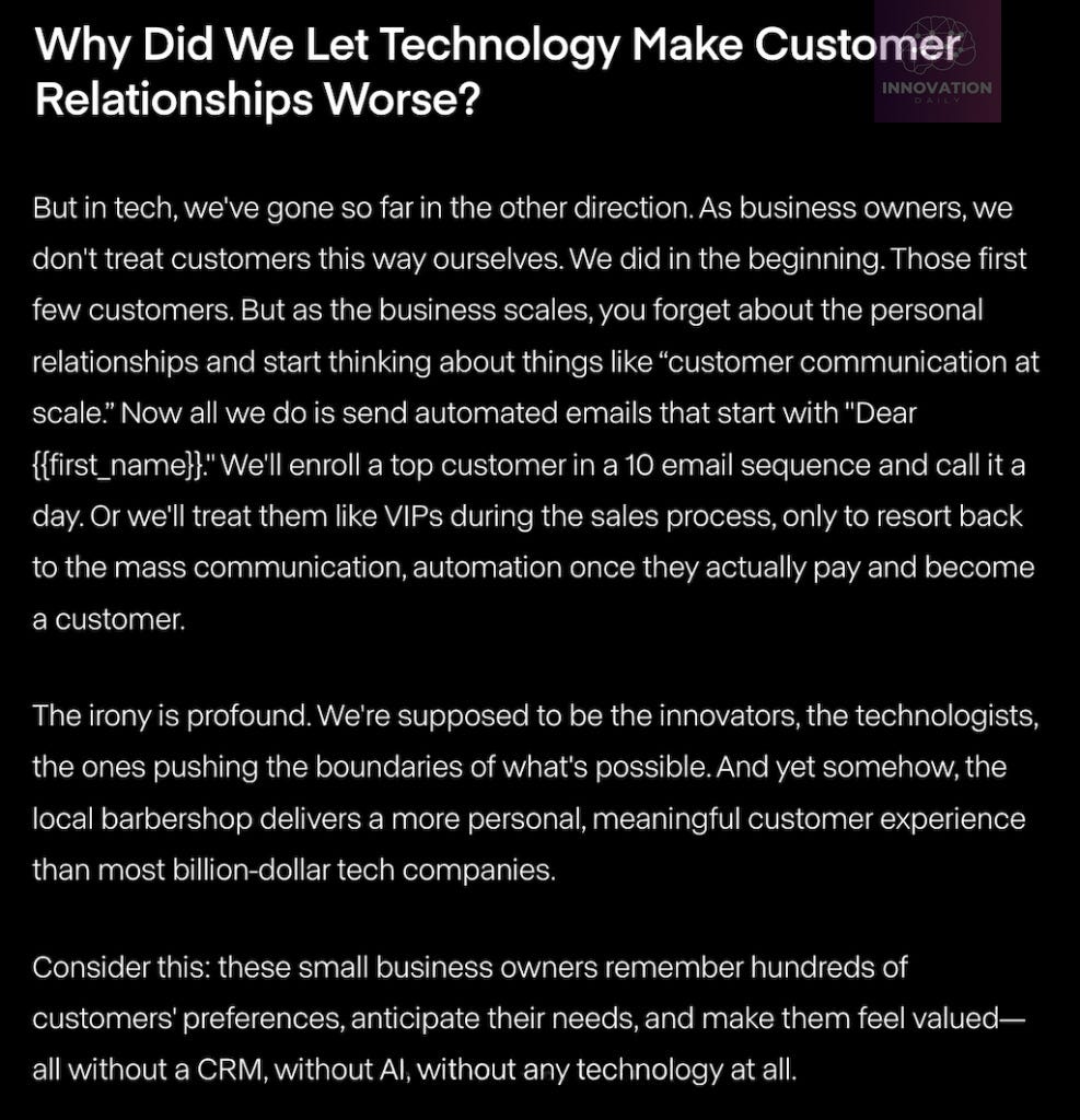 Small cafés and local shops offer deeply personal service without any advanced tools. As companies scale, personalization disappears, replaced by corporate communication templates and automated workflows.