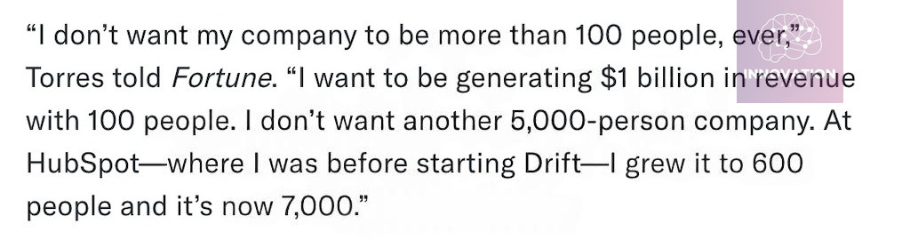 This time he’s solving a deeply personal challenge. He wants to build a company that never grows beyond 100 employees, yet still generates $1 billion in annual revenue. After watching HubSpot grow from 600 people to more than 7,000, he’s determined not to repeat that story.