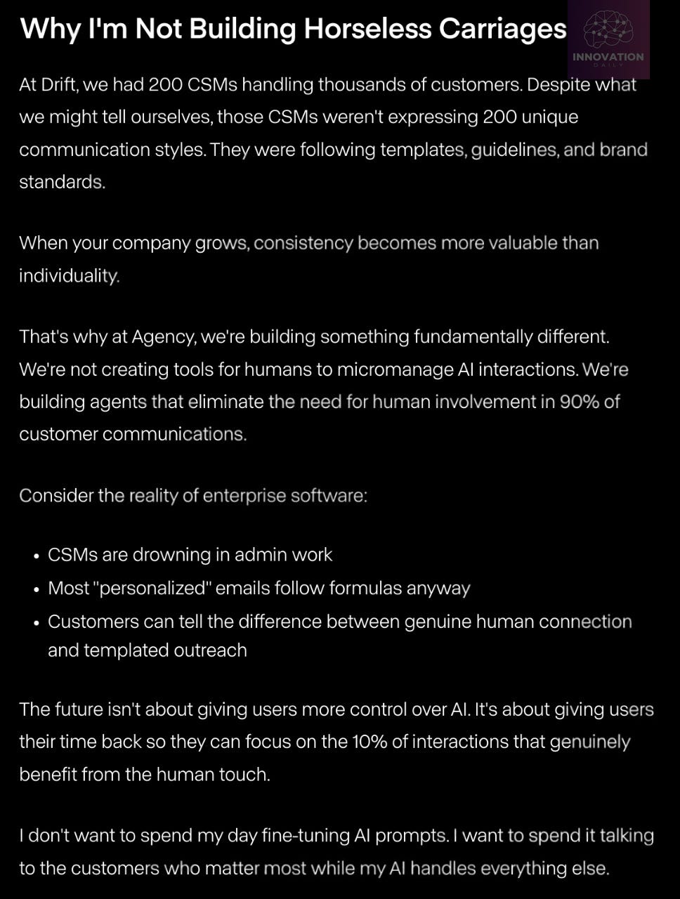 Most modern support tools are essentially “horse-less carriages” — old processes with a shiny engine, but still fundamentally manual. Companies force hundreds of support reps to follow identical scripts, turning people into robots.
